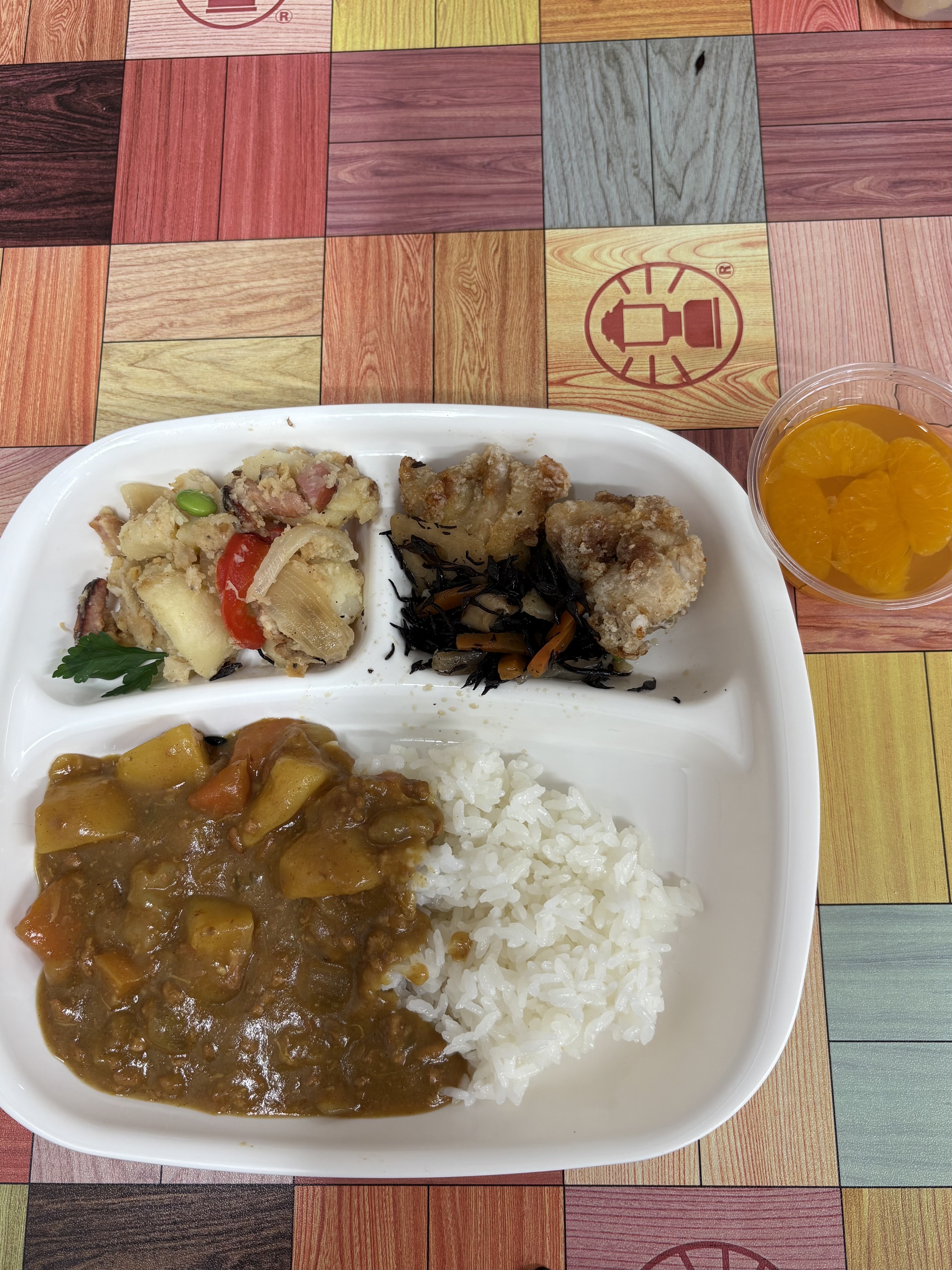 カレーライス・からあげ・ジャーマンポテト・ひじきの煮物・みかんゼリー