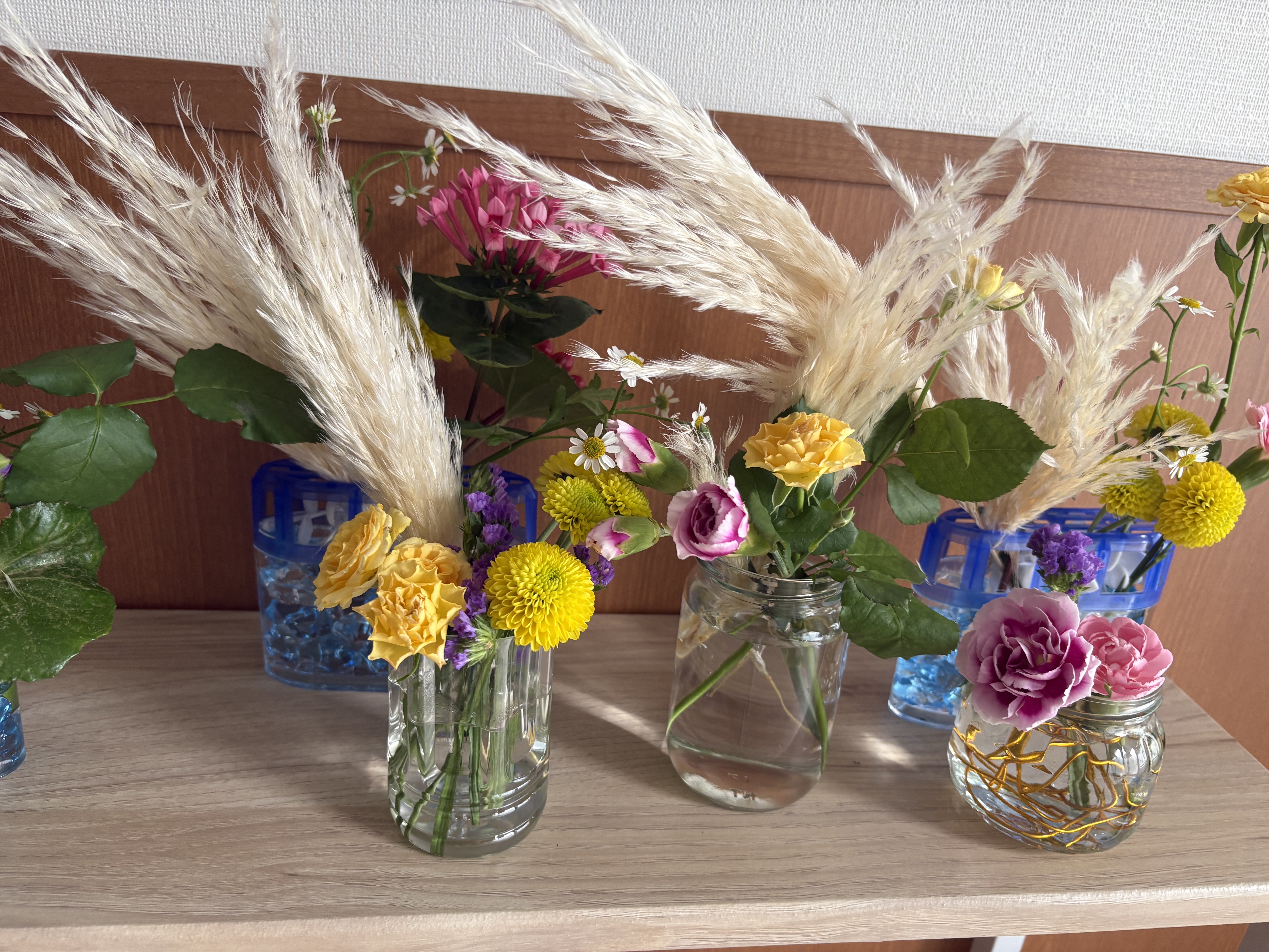 食後には大好評の池の坊の先生をお招きし5月のお花を生けました。ペットボトルにお花を生けたのですが茎の長さ、お花の配置一つで同じお花を使っていても全く違う顔の作品に仕上がっていました。