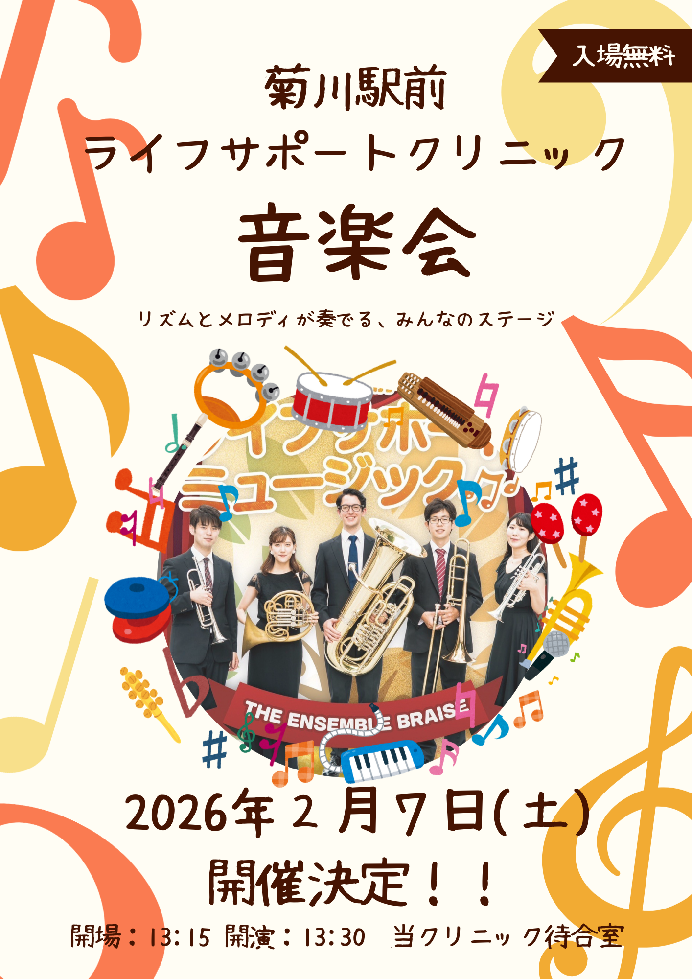 このたび、当院主催「第3回音楽会」を2月7日(土)に開催することとなりました。